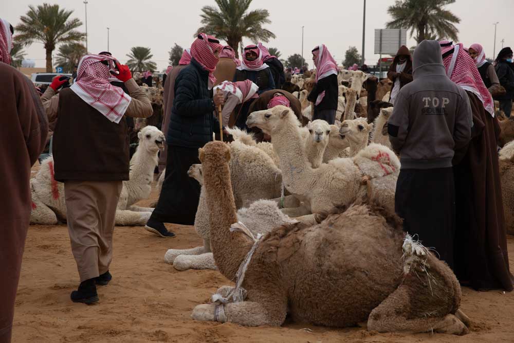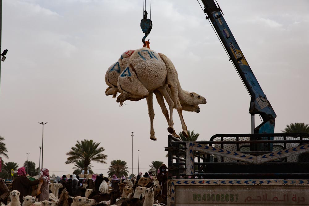 We wake up very early to reach the Al Qassim camel market at the outskirts of Buraydah, the largest in the world. A quick coffee, pack the camp and ready to go at 7am. The market starts at around 6 in the morning and it hosts not only camels, but also goats and sheep. The first thing that surprises us is the size of the goats that are traded here. As we enter the market one huge goat falls from a car and escapes its owner, while trying to keep the other one safe at the back of his Land Cruiser pick-up. Unfortunately for the man, when he starts again, the other big goat jumps from the car and escapes as well. It took quite a while to the man to recover the poor animals that were probably smelling the knife of the butcher.