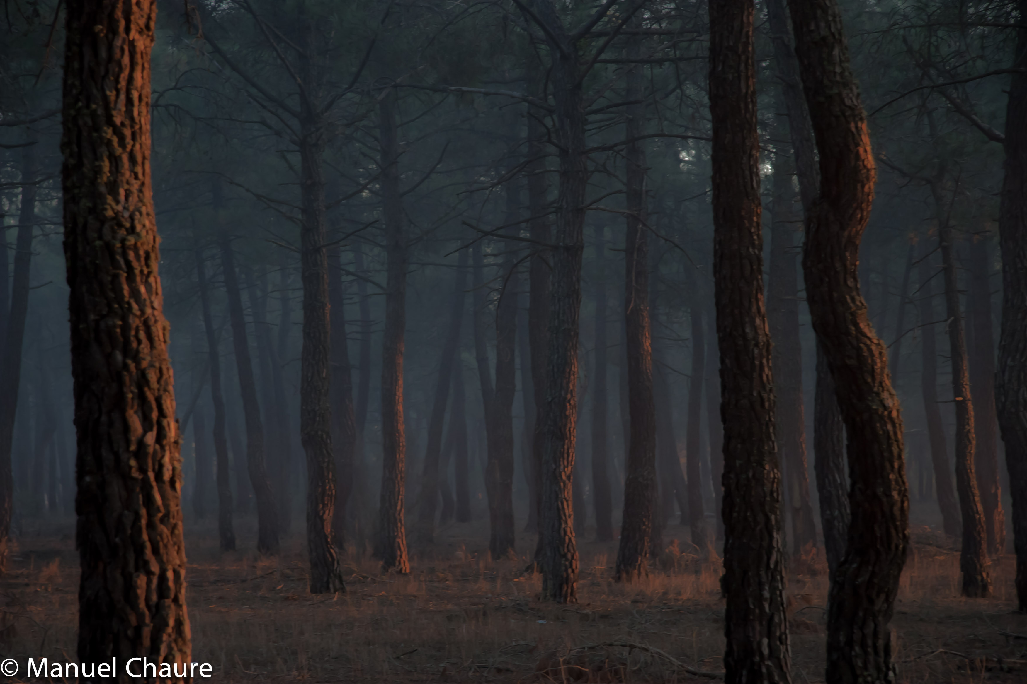 La luz entra en el bosquecillo de pinos al atardecer. Los campesinos de una granja cercana están quemando rastrojos y el humo se cuela entre los árboles, produciendo un efecto misterioso.